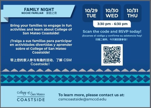 Join us for College of San Mateo Coastside Family Night on October 29th, October 30th and October 31st from 3:30 to 6:30 pm.