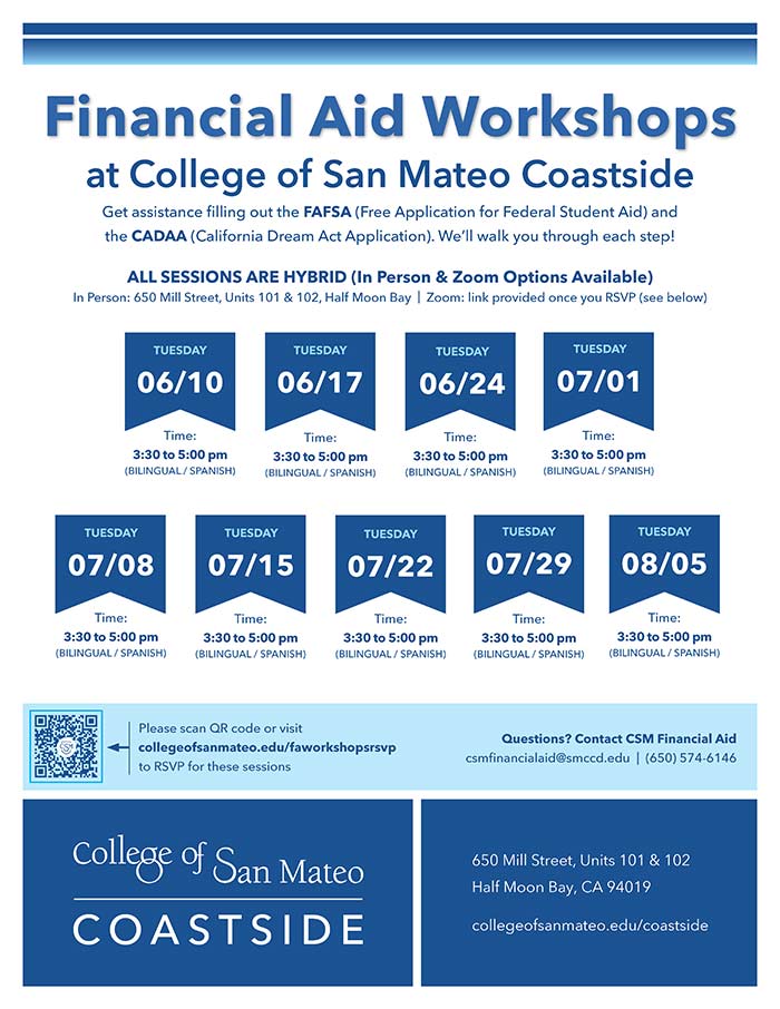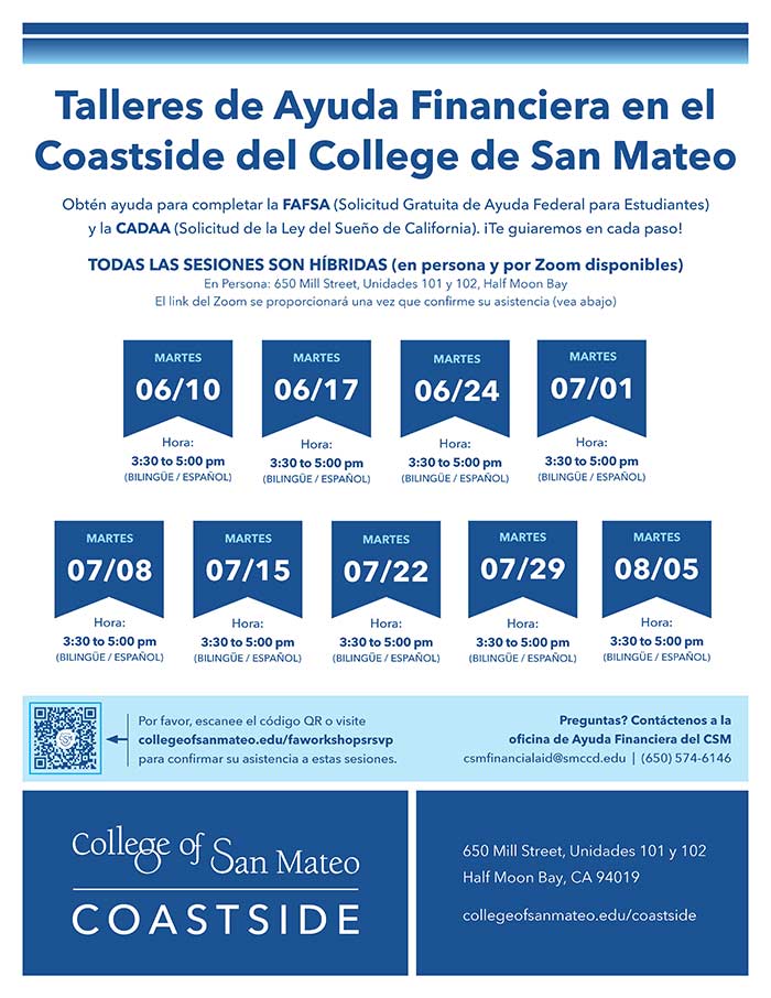 Obtén ayuda para completar la FAFSA (Free Application for Federal Student Aid) y la CADAA (Solicitud de la Ley del Sueño de California). ¡Te guiaremos en cada paso! Todas las sessiones van hacer en 650 Mill Street, Unidades 101 y 102, Half Moon Bay. Por favor, visite collegeofsanmateo.edu/faworkshopsrsvp para confirmar su asistencia a estas sesiones.