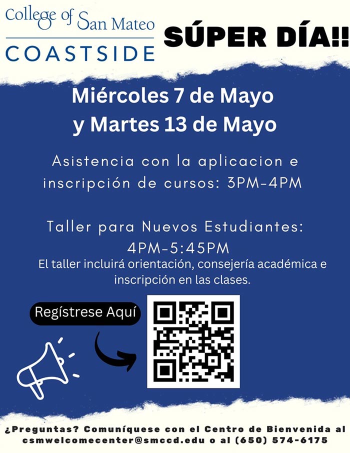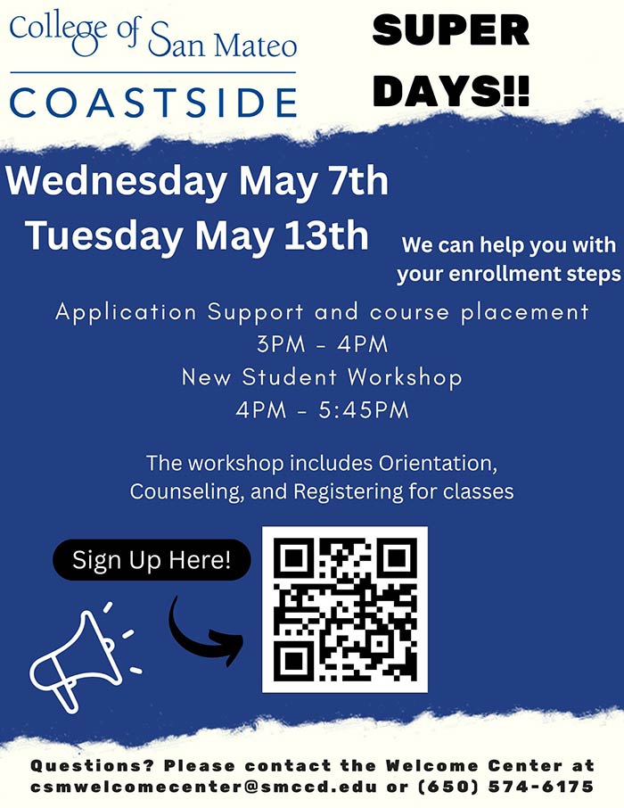 ¡Hazlo todo el mismo día! ¡Únete a nosotros en CSM Coastside para los Super Días! Organizaremos un taller de solicitud, orientación, asesoramiento y te ayudaremos a inscribirte en las clases.