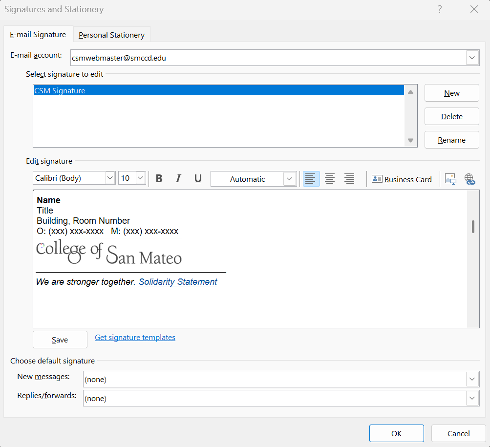- Choose your new signature for New messages and/or Replies/forwards.